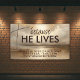 A contemporary modern banner design to share your service times with the community. A golden sunrise is the background for the bold statement "Because He Lives." Customise by adding your church name, service time and any other information. Use for an Easter Sunday service promotion or simply to change up your signage. Banners are a great tool to communicate with the community.