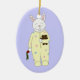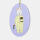 A smiling white rabbit is ready for bed with a carrot in one hand and his teddy bear held up tight against him in the other hand in the mixed media image on this ornament. The bedtime bunny wears pale yellow footy pyjamas decorated with Easter eggs in lavender, pink and baby blue. The customisable back text can easily be changed to say whatever you like. From my original digitally created image.