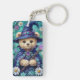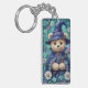 This whimsical keychain features a small bear, tender as a bedtime spell, sits at the heart of a meadow made of midnight and bloom. Round-eyed and gentle, it wears a deep blue wizard’s hat and cloak, both scattered with stars and jeweled with violet light, as if the sky itself had been sewn into fabric. A crystal pendant rests at its chest, glowing softly like a captured moonbeam. Around it, flowers gather in a bright, breathing circle—white petals, purple petals, yellow hearts—each blossom painted with the hush of spring rain and the joy of morning. The bear’s fur is warm honey and cream, soft enough to feel with the eyes alone, a quiet lantern in the garden’s cool glow. UùùúIn one tiny paw, a crystal wand catches the light, a little shard of magic held with the seriousness of a dream. The whole scene feels enchanted and intimate, as though the night has leaned close to listen, and the flowers have opened only to witness the gentle power of this plush little guardian.