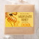 Beekeeper product label featuring a honey dipper spoon dripping with golden honey, attracting the attention of a honey bee. Personalise with the name of your apiary or beekeeper, address, type of honey, beeswax, candles and other apiary products, over a yellow gold honeycomb pattern. Find the matching business cards and cut-comb honey box labels in the collection.