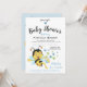 Cute baby boy shower invitation with a sweet bee cartoon and hearts in blue and green.