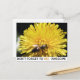 Inspirational postcard featuring an original macro photograph of a honeybee gathering pollen from a yellow dandelion flower on a sunny spring day. The motivational quote, in black and yellow font, reads "Don't forget to bee awesome".