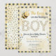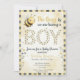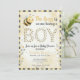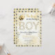 This adorable baby shower invitation depicts a watercolor washed buffalo chequered pattern in black and yellow for the same colour palette as a bumblebee. A playful saying "the buzz is we are having a boy".