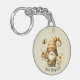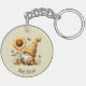 This cute keychain features a gnome on one side holding a bouquet of flowers with a bumble bee flying about. It says "Bee Happy" on the bottom. The reverse side has a cute gnome sitting down holding a flower and a jar of honey. Bees are flying around him. It says "Bee Kind" on the bottom. It's done in soft muted shades of yellows and tans.