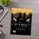 Decorated with happy, smiling yellow and black bumble bees. A chic black background and faux gold glitter drips, paint dripping look. White hand lettered script with swashes and the text: Bee Happy. Personalise and add your name and a year. Perfect for school, work or organising your personal/family life.