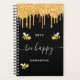 Decorated with happy, smiling yellow and black bumble bees. A chic black background and faux gold glitter drips, paint dripping look. White hand lettered script with swashes and the text: Bee Happy. Personalise and add your name and a year. Perfect for school, work or organising your personal/family life.