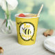 Bee Happy is written in yellow gold typography. Smiling yellow bumble bee with black stripes and fluttering wings.. Buzz is written on both sides of geometric circular black yellow border. Original Artwork © TamiraZDesigns.