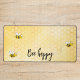 Yellow, white background with a honeycomb pattern. Decorated with happy, smiling bumble bees. Text: Bee happy