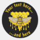 Honey bee with open wings icon over bee hive and honey drops. Custom background colour. Two text fields on circle.