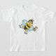 100% cotton so perfect for summer, It is a nicely designed t-shirt, the fabric is soft and the seams finished well, the body of the t shirt has no side seams. I bought a medium size for my two grandsons, aged 9 and 8 it will be slightly big on them but I would rather that than too small