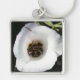 Large square premium metal keychain with an image of five honey bees huddling close, seduced by the allure of the pretty pink wildflower, Clarkia Arcuata, an annual herb native to California. See matching round double-sided acrylic keychain and square charm. See the entire Flowers & Plants Keychain collection in the ACCESSORIES section.
