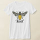 This t-shirt design features an ornate bee on the front with the work "kind" written below in a script font. The bee design is black and yellow on a bright white t-shirt.