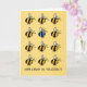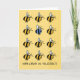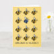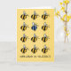 4 rows of smiling kawaii (= cute) bumblebees on a light yellow background with a honeycomb pattern on the right side of the card and underneath the text "Bee-lieve in yourself". In the middle of the design is one blue coloured bee that stands out.