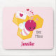 A mousepad with an adorable drawing of a pink and white striped bumble bee. A piece of yellow honeycomb behind. A letter sealed with a heart and a group of floating hearts are also part of the design. Editable text says: Bee Mine.