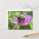 This postcard features a very sharp and colourful image of a bumblebee gathering nectar from a purple thistle blossom.