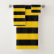 Bath towel set, consisting of a face cloth, hand towel and bath towel with a stripe design. You can customise this bath towel set with any text of your choice. Should you require any help with customising then contact us through the message link on this page. Stripe design bathroom towel set