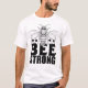 This white t-shirt features a bold, monochrome design. A detailed illustration of a bee is positioned above the words "BEE STRONG" in a strong, blocky font with a slightly distressed texture. Stylised honeycombs are placed on either side of the word "BEE," creating a powerful and nature-inspired message.