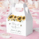 Rustic gender reveal party favour box featuring watercolor illustration of yellow sunflowers and baby's breath with bumblebees with pink and blue wings. The script text says "what will baby bee?"