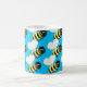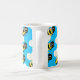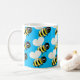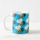 Cute illustration of a swarm of cartoon bees flying about against a blue background. Image available on various gifts and products.