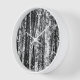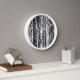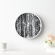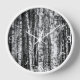Clock in a forest of beech trees, in shades of charcoal grey / grey and white, with white numbers