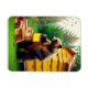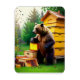 This magnet features a grizzly Bear stealing honey from a beehive.