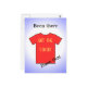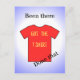 Funny postcard with a witty slogan and image to match. "Been there done that" in black stencil lettering, stamped on a red t-shirt with the accompanying slogan "GOT THE T SHIRT". Blue and white background.