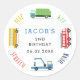 Transport theme birthday party sticker featuring a Blue truck, garbage truck, school bus and a fire truck.