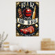 A vintage-style illustration depicting a beer bottle, a grill, and a steak, all on a dark background with gold accents and stars. The text reads, Beer And BBQ Go Together, evoking a classic summer barbecue scene.