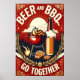 A vintage-style poster featuring a red grill, a bottle of beer, and a juicy steak, all set against a sunset backdrop. The text reads Beer and BBQ Go Together, suggesting a perfect pairing for a summer evening.
