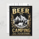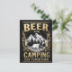 A black and gold illustration depicting a mountain scene with a tent, two beers, and the text Beer And Camping Go Together.