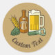 Beer illustration. Bottle, glass, opener, hops and barley. Custom background colour. Custom text.