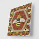 This cute pattern features a graphic motif of busy bees in black and yellow set against a stylised honeycomb design in warm orange and brown hues.