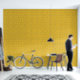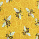 This sweet bee pattern wallpaper shows an original design of honeybees over a light, bright golden-yellow honeycomb background. The yellow and black bees have gossamer white-blue wings. They're crawling over the honeycomb inside their beehive.