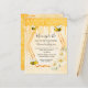Elegant, fun baby shower invitation celebrating a baby girl or gender neutral. Yellow, white background with a honeycomb pattern. With a faux gold geometric frame, and faux gold glitter drips. Paint drip look. Decorated with soft, light yellow tropical florals flowers, hibiscus and happy bumble bees. With the text: Mummy to Bee and the name of the mother to be on front written with a modern hand lettered style script. Black letters.