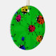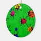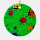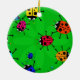 Colourful illustration of a swarm of colourful cartoon ladybugs scuttling around on a green background. Image available on various gifts and products.