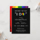Charming lgbt rehearsal dinner invitation with rainbow pride heart in before they say I do against a black background.