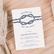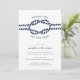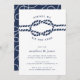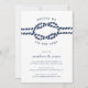 Our coastal chic wedding rehearsal dinner invitations feature classic nautical styling in navy blue and white. "Before we tie the knot" appears at the top, curved around a navy blue knotted rope illustration. Personalise with your rehearsal dinner details beneath in a chic combo of serif and sans serif lettering. Perfect for nautical, beach themed or summer rehearsal dinners. Cards reverse to a looping nautical rope pattern in white on navy.