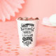 This hot beverage cup features whimsical hand lettering that says "Behind every woman is a substantial amount of coffee." on a white background. The lettering features decorative swashes and ornamental swirls.