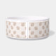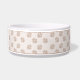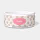 Beige dog paw print pattern background with a pink badge that has a personalizable text area for the name of the pet. The font is a lovely script font in white colour.