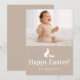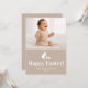 Destei's beige Easter card template featuring a bunny silhouette and two Easter eggs in white color. The top half is a photo template for a custom family photo and the bottom displays a “Happy Easter!” message with space for a family name and year. Perfect for creating a cute, personalized Easter greeting. The other side of the card is beige.
