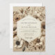 A muted beige and cream floral arrangement surrounds a central emblem. Delicate blossoms and foliage create a romantic, earthy atmosphere, evoking a vintage, botanical feel.