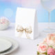A versatile folded paper table tent with a beautiful illustrated bow. Comes blank so you can write your own text by hand — perfect for food labels, name cards, favor tables, candy buffets, reserved signs and more. A budget-friendly option for First Communion, Confirmation, Sweet 16, Quinceañera, baby showers and birthday parties.