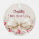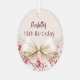 A beige, cream coloured background. Decorated with a large bow and pink flowers. Personalise and add a name, age and birthday date.