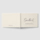 Guestbook with elegant grey script calligraphy on a light beige linen texture print background.