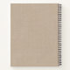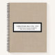 Modern notebook features a minimal design in beige linen textue with black and white accents. Custom name, title and company name presented in a framed window in classic block typography.