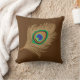 Vector drawing of a peacock feather, enhanced and rendered in a soft conte crayon effect - soft golden beige and tan feather, with rust, cobalt blue, and emerald green eye, on a chocolate brown background throw pillow