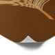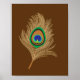 Print in a vector drawing of a peacock feather, enhanced and rendered in a soft conte crayon effect - soft golden beige and tan feather, with rust, cobalt blue, and emerald green eye, on a chocolate brown background