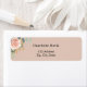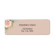 Beige background colour. A rose gold and blush pink rose, floral and eucalyptus greenery and faux gold foliage. Personalise and add your name and address. Black letters.