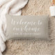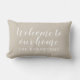 Neutral beige and white create an understated, versatile look on this personalised indoor lumbar pillow featuring Welcome to Our Home in flowing script with your family name. The warm neutral tone blends seamlessly with any decor style, from farmhouse to coastal to modern. All text is fully customisable.