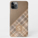 Contemporary tan, brown, beige, taupe, ivory cream white tartan plaid, and a faux leather texture pattern background. With room to customise or personalise with a name monogram or initial of your choice. Beautiful, modern, and cool cover for the trend-savvy and art-loving hip trendsetter, artsy motif lover who wants to protect their phone from dust and dirt, wear and tear. This design is available for Apple iPhone 6, 7, and 8 Plus, 10 or X, XR, XS, 11, 12, 13 Mini, 14, 15 Plus, and Pro Max cellphone cases. Show off your style, look fashionable, and feel stylish with a unique design on a mobile device accessory of your choice.